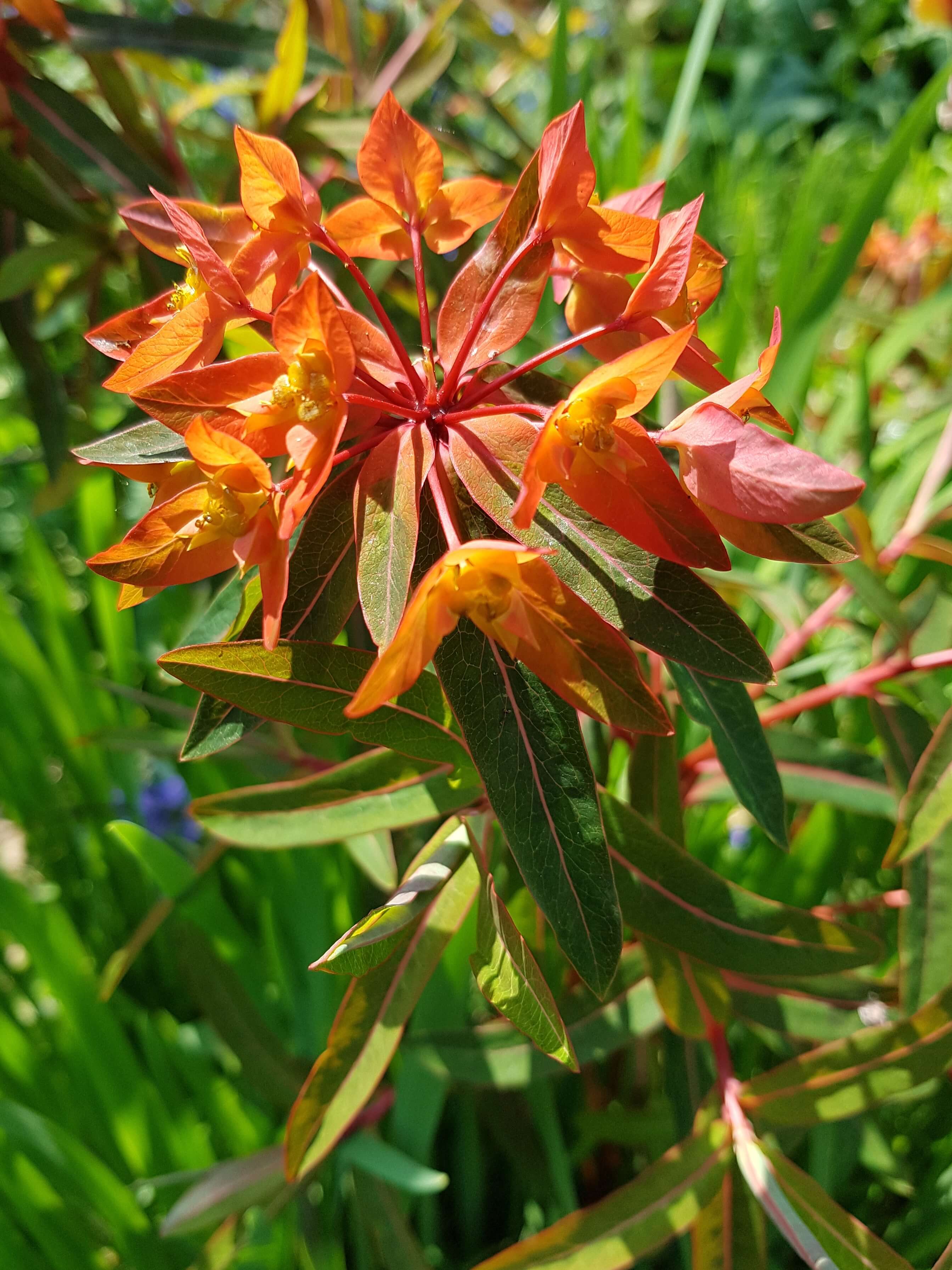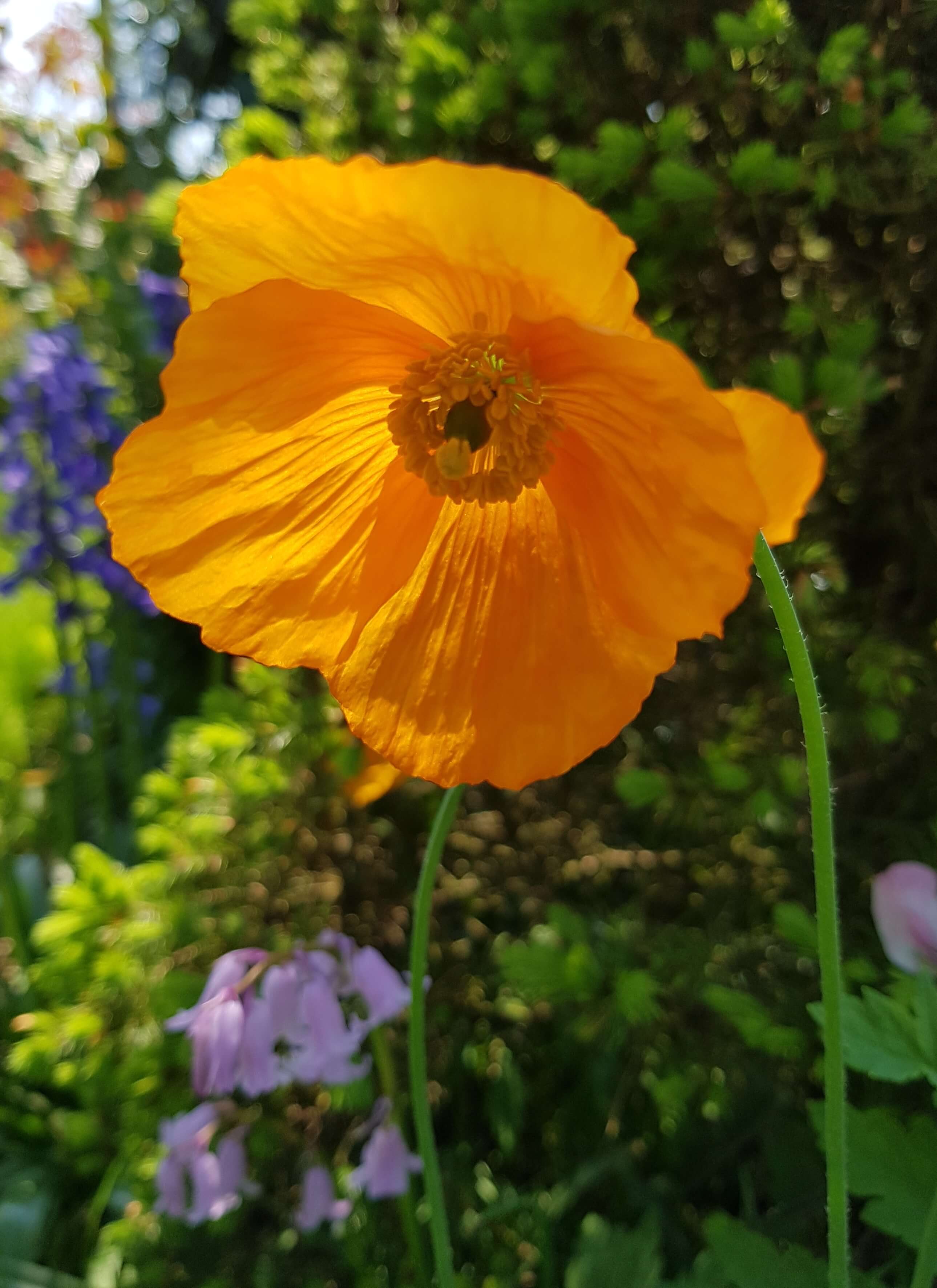 Orange poppy with sun shining through the petals making them glow. Bluebells in front of lots of green foliage. Orange Euphorbia flowers with red and green leaves. White and pink Broom shrubs with blue sky in the background.